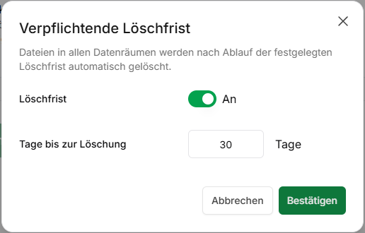 - Obergrenze: Die individuelle Löschfrist eines Datenraums darf die verpflichtend definierte Frist nicht überschreiten.